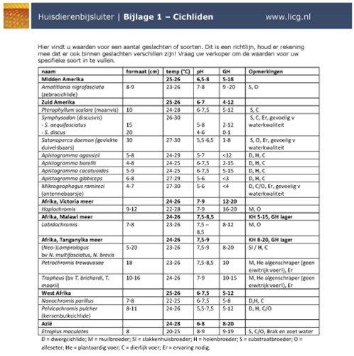 Zie de tabel van bijlage 1 (zie PDF) en vraag voor aanschaf na wat de eisen zijn van de soort die u wilt gaan houden.