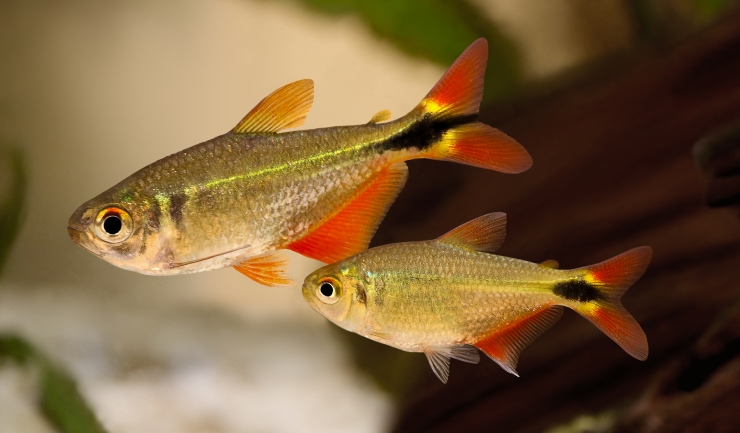 Bij sommige soorten zijn de verschillen wat duidelijker. Bij een aantal Hyphessobrycon soorten, zoals de bloedvlektetra, de rode fantoomzalm en de zwarte fantoomzalm, is de rugvin van het mannetje groter en langer dan die van het vrouwtje. Het vrouwtje van de rode fantoomzalm heeft bovendien een rugvin die zowel rood als zwart en iets wit gekleurd is, terwijl die van de man vrijwel helemaal rood is.