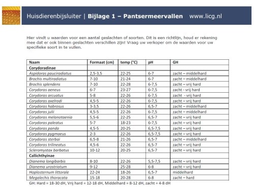 In bijlage 1 (zie PDF) vindt u een aantal voorbeelden van soorten en hun geschikte waterwaarde. Vraag voor de overige soorten voor aankoop de precieze waarden voor de soort van uw keuze na bij uw aquariumspeciaalzaak.