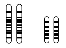Afb. 1: twee paar gewone chromosomen (autosomen) met daarop de genen.
