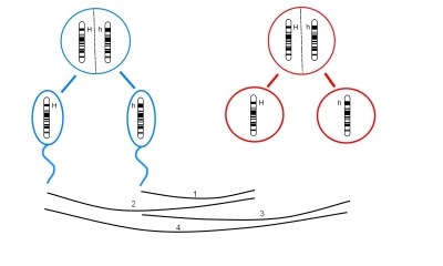 Afb. 5: De blauwe geslachtscellen (links) komen van vader, de rode (rechts) van moeder. Er zijn 4 verschillende combinaties mogelijk: 1) h + H (kort) 2) H + H (kort) 3) h + h (lang) 4) h + H (kort).