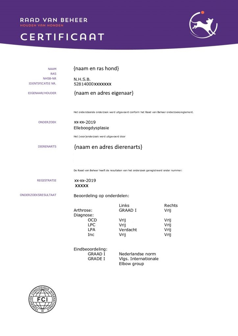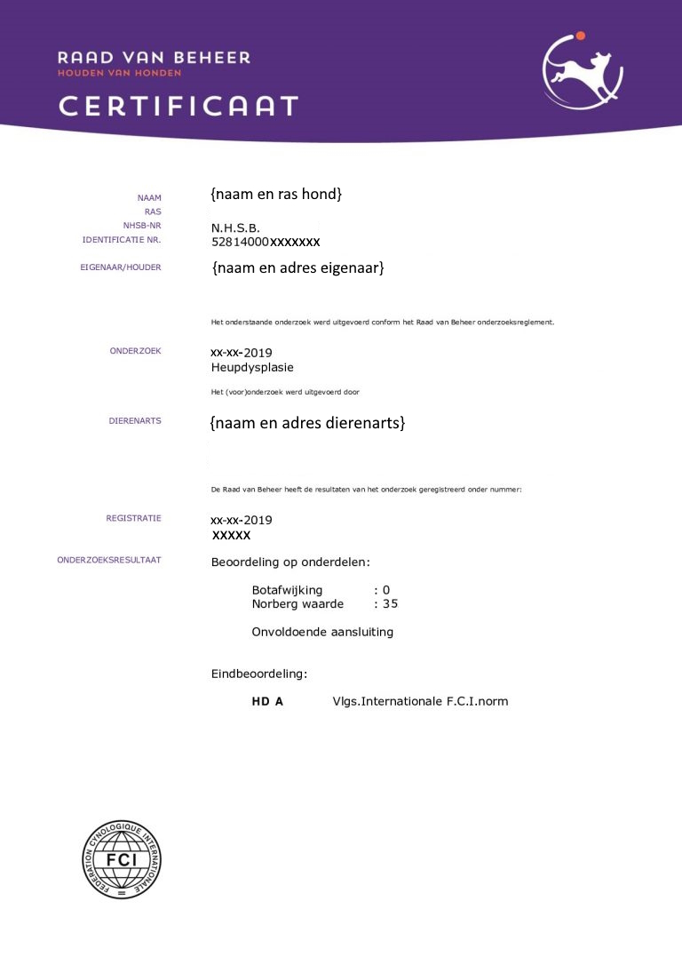 Op de website van de Raad van Beheer kunt u zien hoe een officieel FCI-stamboomcertificaat, uitgegeven door de Raad van Beheer, eruitziet. Op hun website DutchDogData kunt u ook de stamboom van de ouders van uw pup opzoeken.