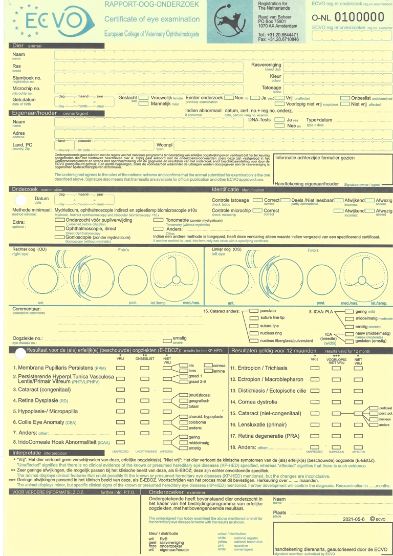 Hieronder vindt u een paar voorbeelden van hoe certificaten van onderzoek naar Heupdysplasie, Elleboogdysplasie en ECVO oogonderzoek eruit zien.