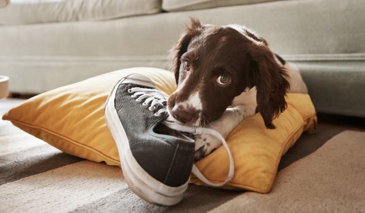 - Het verwijderen van losliggende spullen. Zorg ervoor dat u geen schoenen laat slingeren, dat de afstandsbediening niet op een laag tafeltje ligt, dat er geen boeken of cd’s op lage kastplanken staan. Pups onderzoeken alles met hun tanden. Dit duurt een paar maanden. Als ze in die maanden leren dat uw schoenen goed kauwmateriaal zijn, hebt u kans dat de hond dit blijft doen. Zorgt u ervoor dat verboden voorwerpen gewoon niet aanwezig zijn, dan kunt u ze een paar maanden later weer neerzetten zonder dat de hond er aan komt. Zijn behoefte om overal op te kauwen is dan weg.