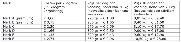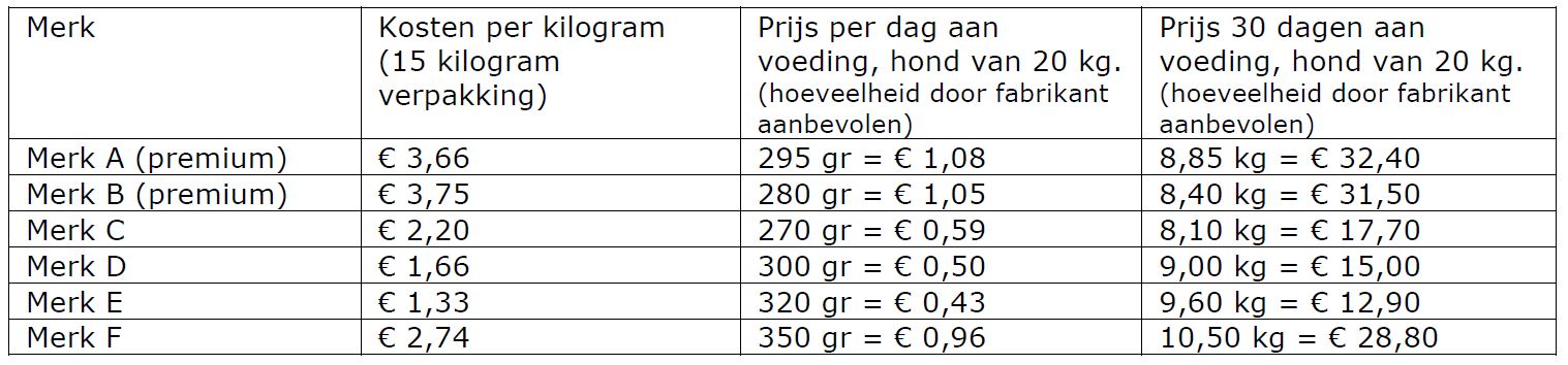 De prijs per kilogram is niet zomaar één op één te vergelijken. Van het ene merk voer moet dezelfde hond meer voer per dag krijgen dan van het andere, omdat het voer minder energie en voedingsstoffen levert per gram. Om te weten hoe duur de voeding zal uitvallen, moet men dit dus eerst omrekenen.