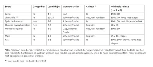 In onderstaande tabel vindt u een aantal kenmerken van verschillende veel gehouden knaagdiersoorten. Wellicht helpt dit u een eerste selectie te maken. Voor meer informatie kunt u de huisdierenbijsluiters raadplegen, zodat u een goed overwogen keuze kunt maken. Houd ook rekening met mogelijke verschillen binnen een soort, zoals vachttypen, die er onder andere toe kunnen leiden dat u meer of minder tijd aan de verzorging kwijt bent.