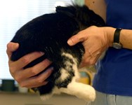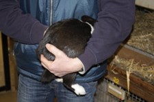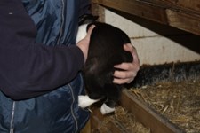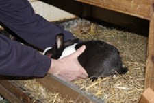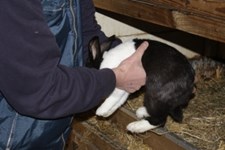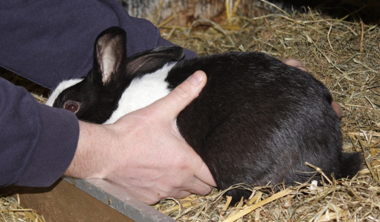 Rechtshandige knipper: de linkerarm duwt het konijn wat tegen de buik van de knipper en houdt de achtervoet iets omhoog, de rechterhand knipt.