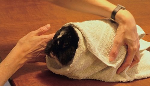Sla de voorrand van de handdoek een stukje over voorpoten heen. Vouw nu één voor één de beide zijkanten van de handdoek over het konijn heen, zo dat de kop wat naar buiten blijft steken. Vouw de achterkant van de handdoek omhoog over de rug van het konijn. Bij rustige konijnen is het niet nodig dat de handdoek strak zit, soms is losjes om het dier heen leggen al voldoende, maar bij wildere konijnen moet het wat steviger. Let wel op dat de handdoek niet te strak om de nek zit. Zorg er bovendien voor dat de neus vrij blijft zodat het konijn kan ademen.
