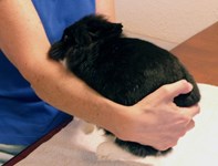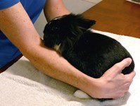 Druk het konijn direct zachtjes tegen u aan, liefst met een kop onder uw arm om hem rustiger te houden. Voorkom dat hij zich met zijn achterpoten kan afzetten door zijn achterwerk, dus zijn bekken, te ondersteunen en tegen u aan te klemmen maar de achterpoten los te laten hangen.