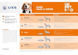 Een duidelijke Body Condition Score is de Pet Size-o-meter, ontwikkeld door UK Pet Food. Het LICG heeft deze met toestemming vertaald en omgezet naar de Maat-o-meter. Er zijn Maat-o-meters voor verschillende diersoorten. Onderaan dit artikel vindt u de Hond Maat-o-meter en de Kat Maat-o-meter. Met behulp daarvan kunt u de score van uw dier bepalen.